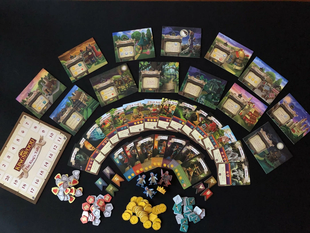 Deluxe edition of Kingswood. This version contains everything in the regular edition ofΒ KingswoodΒ and theΒ Kingswood: Kickstarter Promos, which features a King’s Favor coin, bonus location (Docks), and bonus character guild (Panzoo Tapestry). The component upgrades include wooden resource tokens (swords, hearts, spell books)and metal coin set.