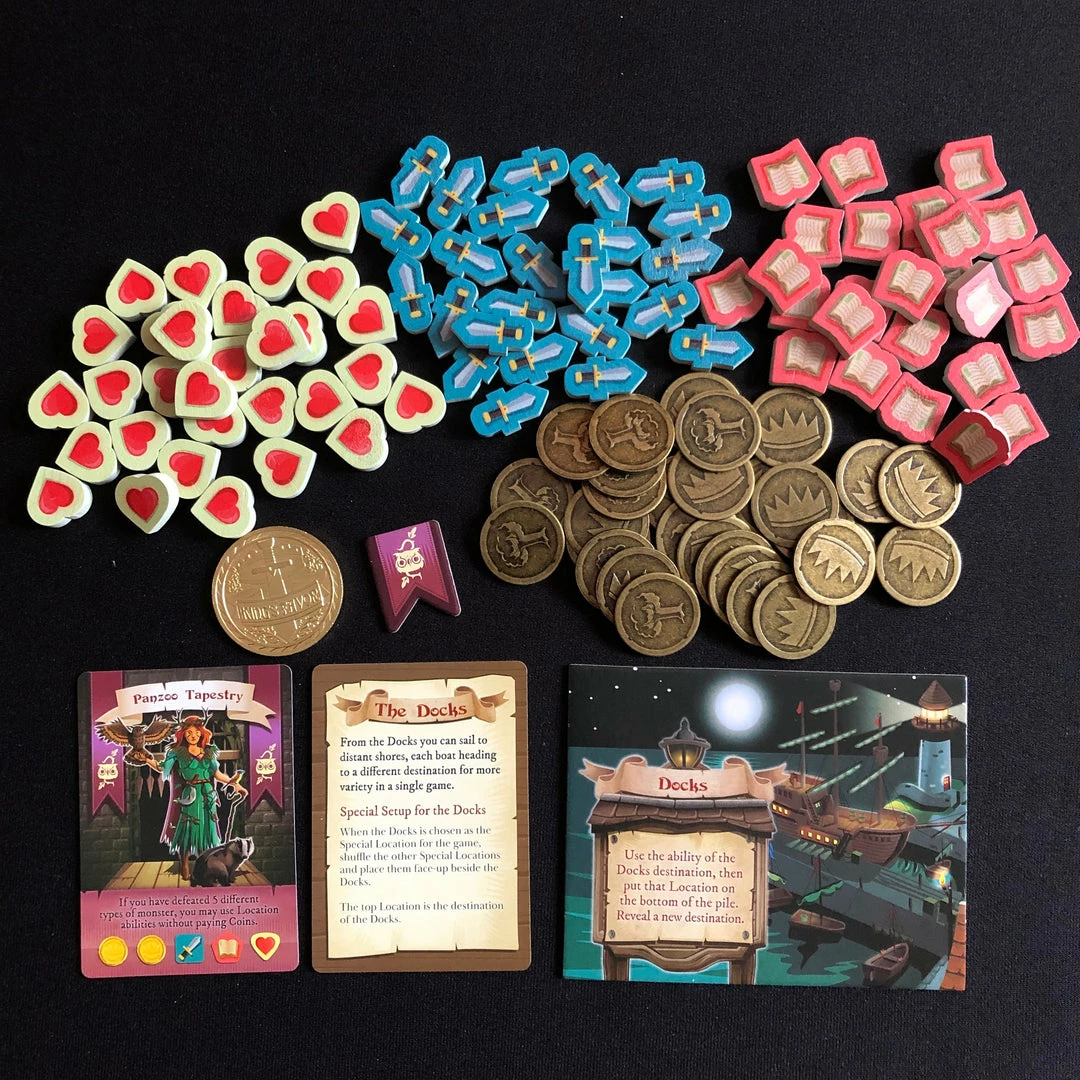 Players take turns controlling the guild’s adventurers moving about the village. The purpose of traveling to different locations is to either build up new or refresh your existing resources. For example, you will visit the Blacksmith for your swords, the Academy for your spell books, the Market for coins, and the Tavern for your hearts. Liquid courage perhaps? There are also 7 other locations in the game, of which you will use one per game. This adds variety to the playing experience as these special locations have a wide range of abilities.