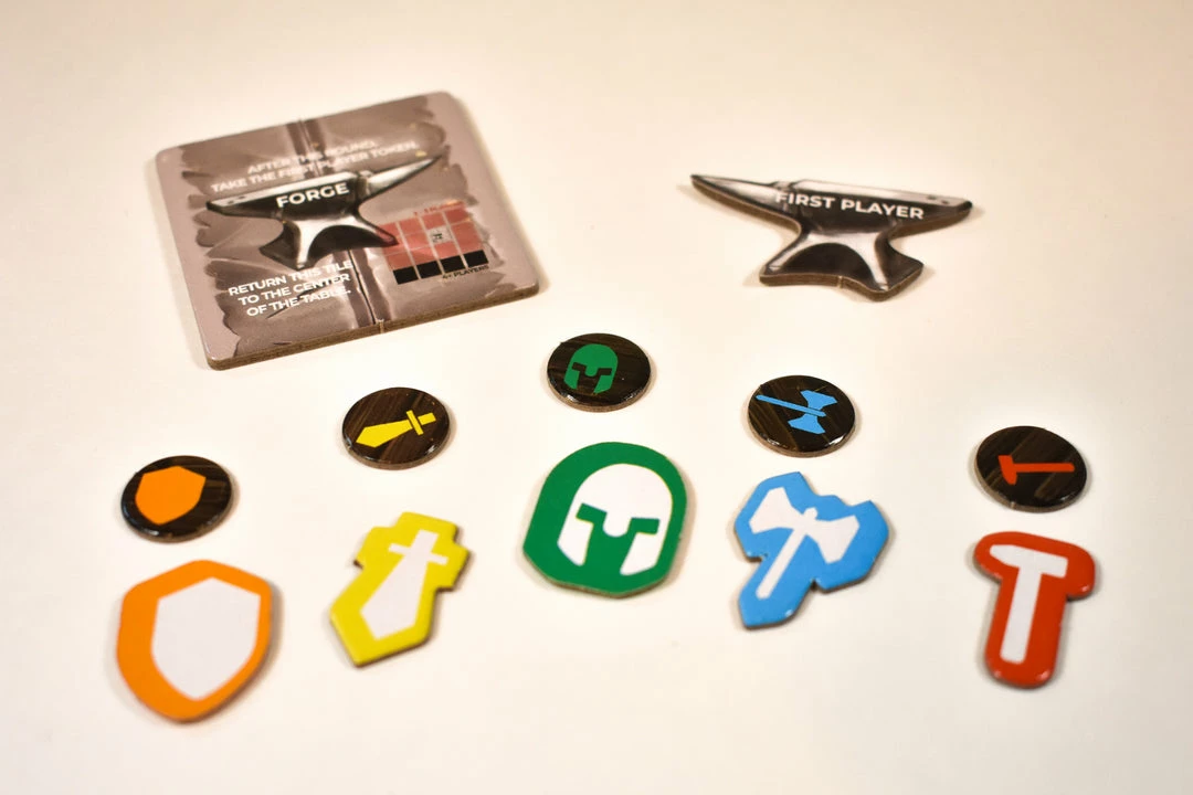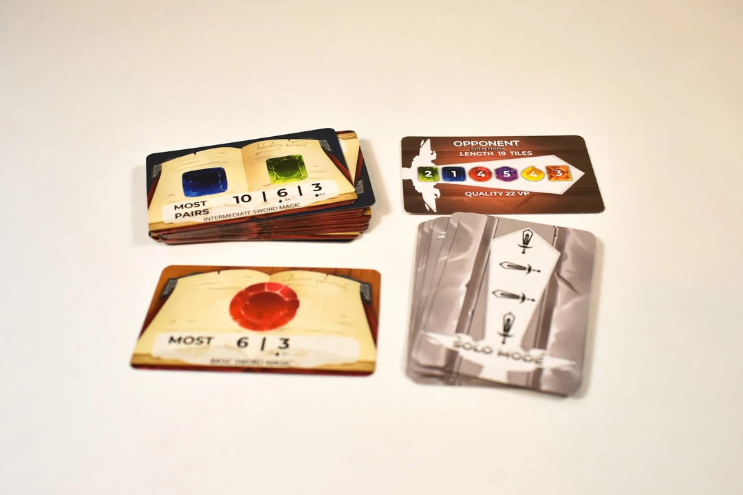InΒ Swordcrafters, players compete to forge the best sword scoring based on length, quality, and magic. Each round each player makes one cut in a grid of sword tiles to create a separation. After separations phase, each player selects one grouping of sword tiles and assembles them into their sword. When there are not enough sword tiles to form a new grid, scoring occurs.