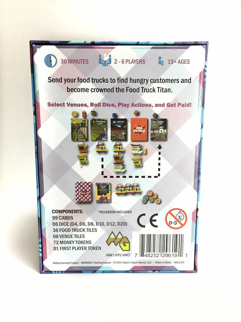| Truck Off is a lightweight food truck card game that packs some serious bite! In Truck Off, you send your food truck team hoping to score a sweet parking spot at a lucrative venue. Your timing and game plan will be critical to your success while your opponents will look for the perfect opportunity to get you to, ahem, truck off! Truck Off is played over five rounds, after which the player with the most money earned wins. Each round, players simultaneously select, then reveal which venue they will park at placing their food trucks next to that venue. A die is then rolled at each venue to determine how many people actually showed up at each venue. Each player then simultaneously selects which special action(s) they choose to execute this round. Starting with the first player token, players play and execute one action in a clockwise manor until all actions have been played and executed. After players are done executing actions, profits are split between each truck at the venue. Truck Off game-play mechanically captures the ups and downs of a food truck owner by rewarding both long-term planning and short-term tactics as well as throwing many curve-balls such as low venue attendance, competition, and crazy weather. Select Venues, Roll Dice, Play Actions, and Get Paid! |