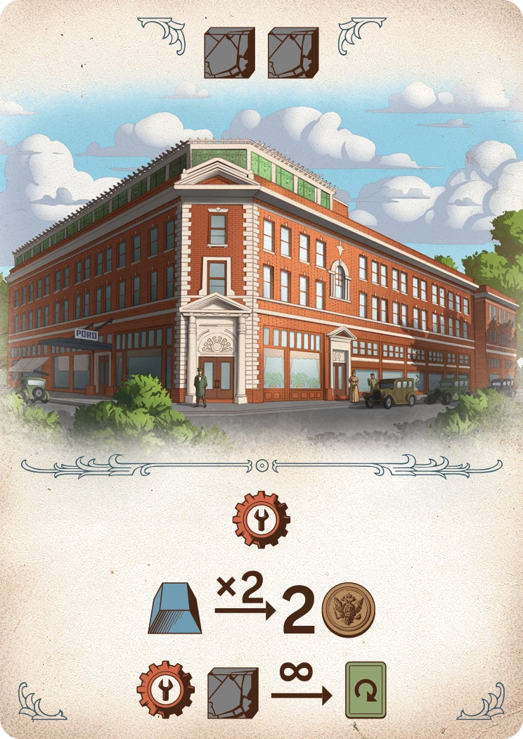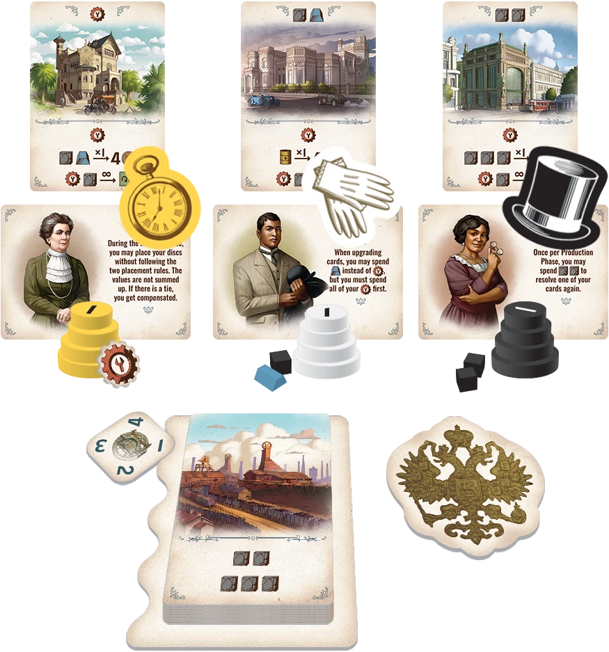 Furnace is an engine-building Eurogame in which players take on the roles of 19th-century capitalists building their industrial corporations and aspiring to make as much money as they can by purchasing companies, extracting resources, and processing them in the best combinations possible. Each player starts the game with a random start-up card, the resources depicted at the top of that card, and four colored discs valued 1-4. The game is played over four rounds, and each round consists of two phases: Auction and Production. During the auction, 6-8 company cards are laid out with their basic sides face up. Players take turns placing one of their discs on one of these cards, but you cannot place a disc on a card if a disc of the same value or color is already present. Thus, you’ll place discs on four cards. Once all the discs are placed, the cards are resolved from left to right. Whoever placed the highest-valued disc will claim this card, but first anyone with a lower-valued disc on this card will gain compensation, either the resources depicted multiplied by the value of their disc or a processing ability (exchange X for Y) up to as many times as the value of their disc. Once all the cards have been claimed or discarded, players enter the production phase, using their cards in the order of their choice. Each company card has one action β either production or processing β on its basic side and two actions on its upgraded side. During the production phase, you can use each of your cards once to gain resources, process those resources into other resources or money, and upgrade your cards. At the end of four rounds, whoever has the most money wins. Furnace also includes capitalist cards that contain unique effects, and if you want, you can choose to deal one out to each player at the start of the game. For an additional challenge, you can require players to create a “production chain”, with each newly acquired company card being placed somewhere in that chain and locked in position for the remainder of the game.