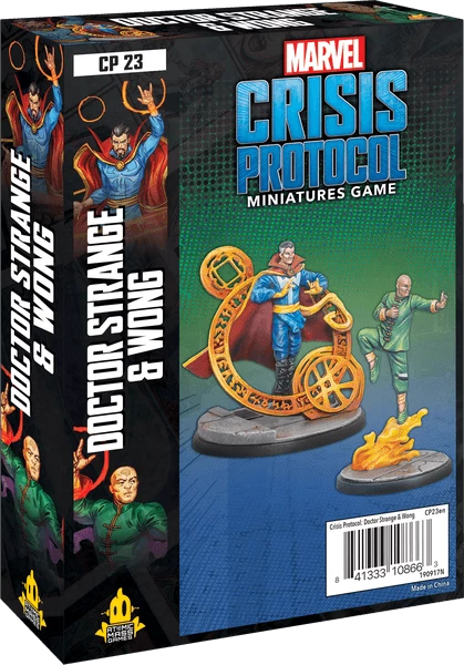 Marvel: Crisis Protocol β Doctor Strange & Wong contains a miniature of each character, two character stat cards, three team tactic cards, one affiliation card, one Infinity Gem card, and twelve tokens.