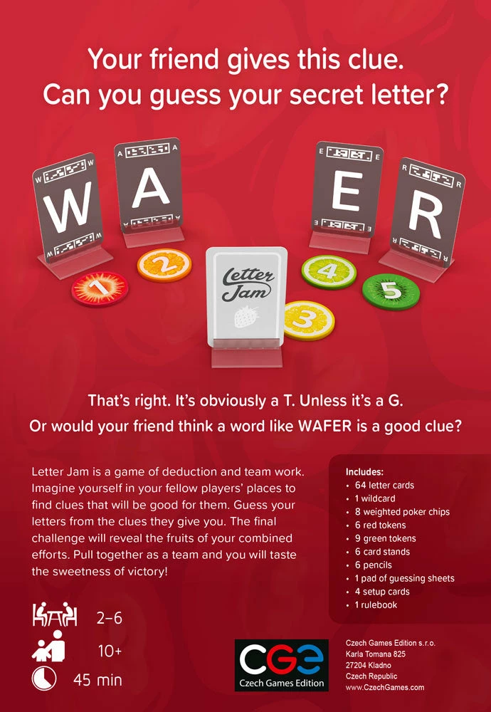 Letter JamΒ is a 2-6 player cooperative word game where players assist each other in composing meaningful words from letters around the table. The trick is holding the letter card so that itβs only visible to other players and not to you.