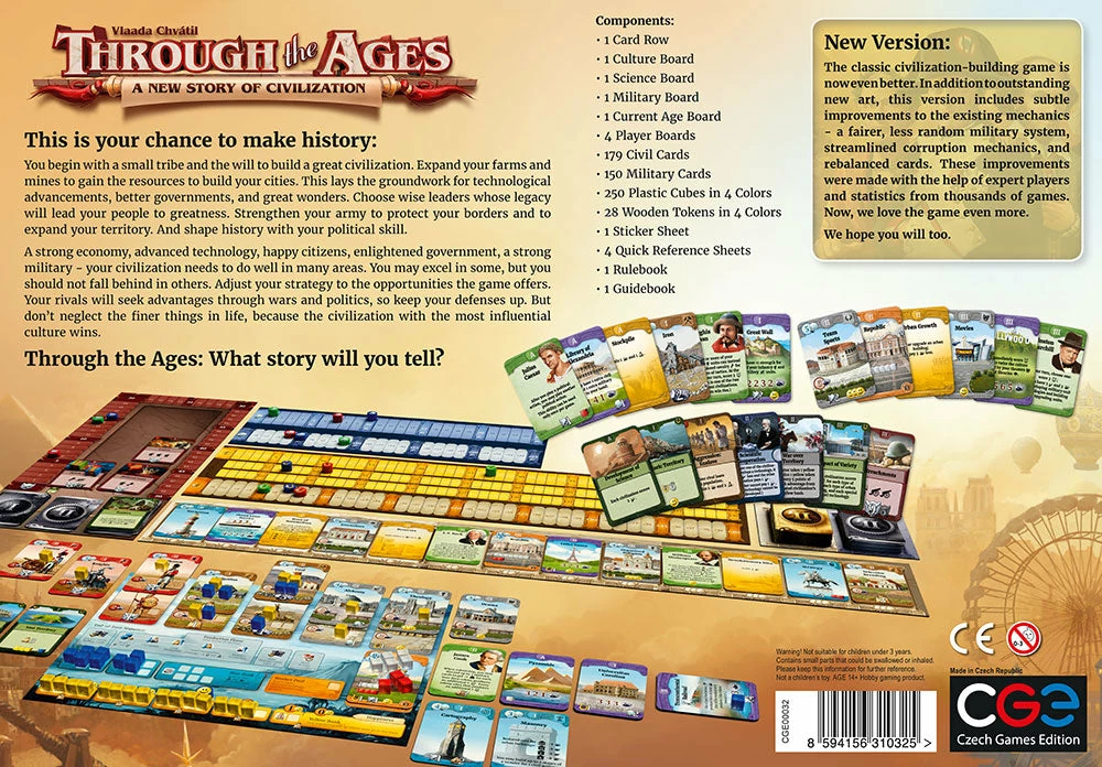 Through the Ages: A New Story of CivilizationΒ is the new edition ofΒ Through the Ages: A Story of Civilization, with many changes small and large to the game’s cards over its three ages and extensive changes to how military works.