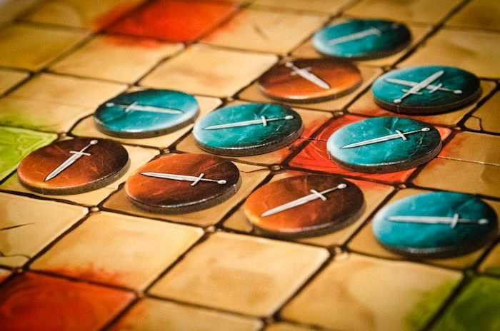 The game includes four different factions, each with a unique deck of beings to summon and one deck of legendary creatures. Players take turns placing their common pieces on the board, and if they succeed in creating patterns depicted on one of the cards in hand, they may play it. When played, the card summons a particular being and allows the player to perform an effect described on the card: a giant destroys neighboring pieces, a knight moves through enemy pieces, a warlord orders previously placed pieces to move and fight, an enchantress converts enemy pieces to player’s own color, etc. After that, the player discards the card and the summoned being turns into a motionless piece which may be used in patterns for summoning other beings β or even be awakened and moved into combat by the effects of other cards.