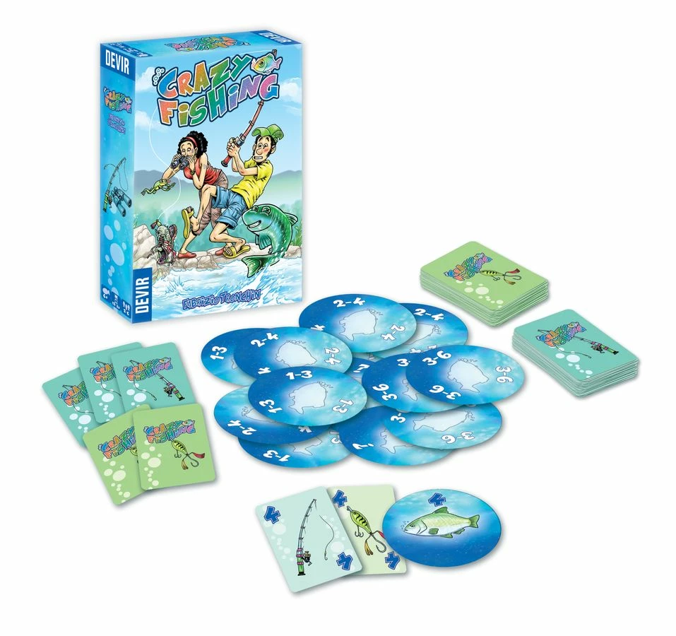 InΒ Crazy FishingΒ two to six players become fishers who compete to catch the biggest fish in the sea. You play over a number of rounds divided into three steps: The cast, where all players play simultaneously and choose and play one Rod’n’Reel card and one Bait card; The catch, where they catch fish based on the Speed of the Rod’n’Reel cards and Reel’em in! where you refill your hand. The winner is the player who has the highest scored obtained catching fishing and bonus cards.