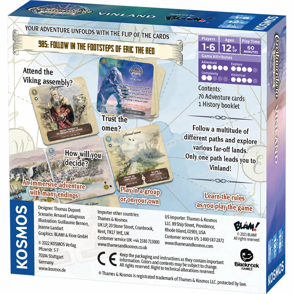 Travel the seas with famous Vikings! It is the year 1000 and you are following in the footsteps of Viking explorer Erik the Red on an epic journey to the new world. Will you find your way to Vinland? Up to six players can take part in this collaborative adventure game, deciding together how to proceed at every juncture. Card by card, the team learns how the adventure unfolds, exploring locations, and moving toward one of five possible endings of the game. Letβs go on an adventure! Follow different paths and explore far-off lands. Only one path leads you to Vinland!