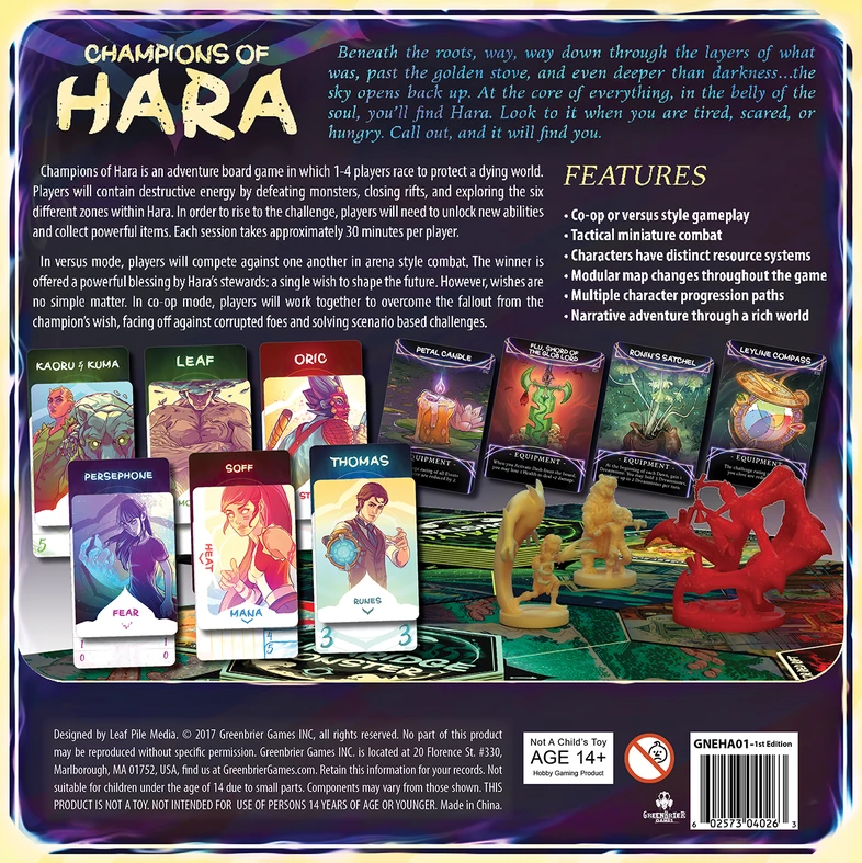 Champions of Hara is an adventure board game in which 1-4 players race to protect a dying world. Players will contain destructive energy by defeating monsters, closing rifts, and exploring the six different zones within Hara. In order to rise to the challenge, players will need to unlock new abilities and collect powerful items. Each session takes approximately 30 minutes per player.