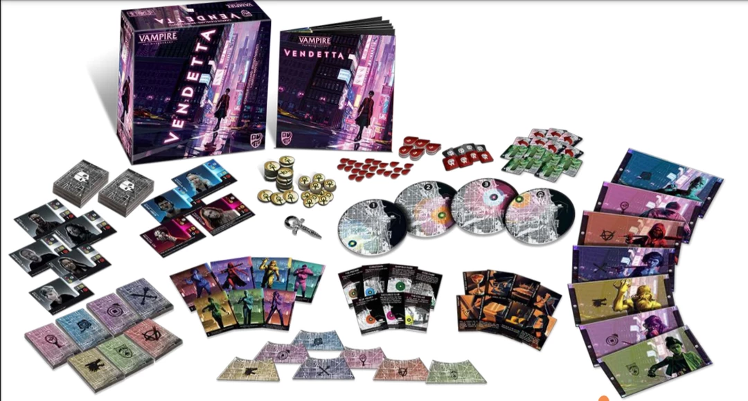 VendettaΒ is a game of area control, bluff and treachery in which you scheme and fight for influence and power as immortal vampires! Play cards and blood to earn the control of influential humans, feed on them, and make them your servants; your goal is to gain the most influence over three ages. You draft cards at the beginning of the game, then gradually draw an increasing number of cards from your deck at the beginning of each age (i.e., all the cards you had during the previous age, plus new ones).