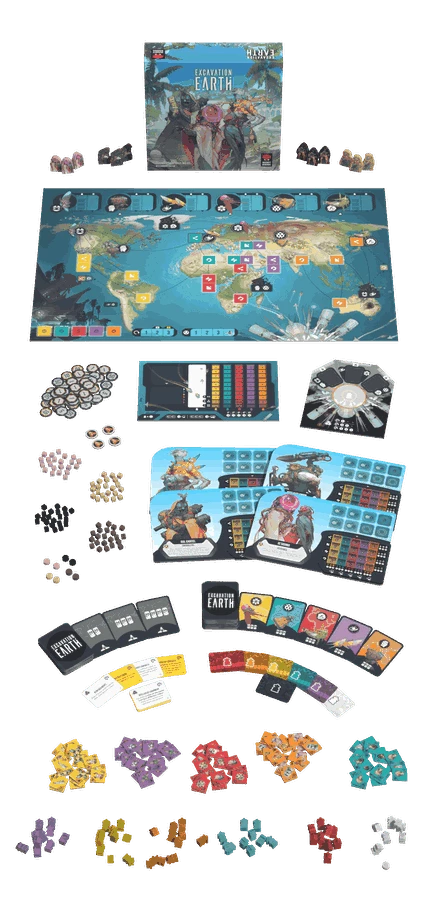 Excavation EarthΒ is divided into three rounds, each of which starts with players drafting a hand of multi-use cards that will be used to perform actions. Players then take quick turns playing actions that allow them to move their explorers around the world map, excavate for artifacts, and deploy traders to bazaars and influencers to affect prices and wheel and deal on the black market.