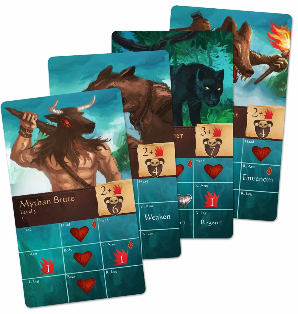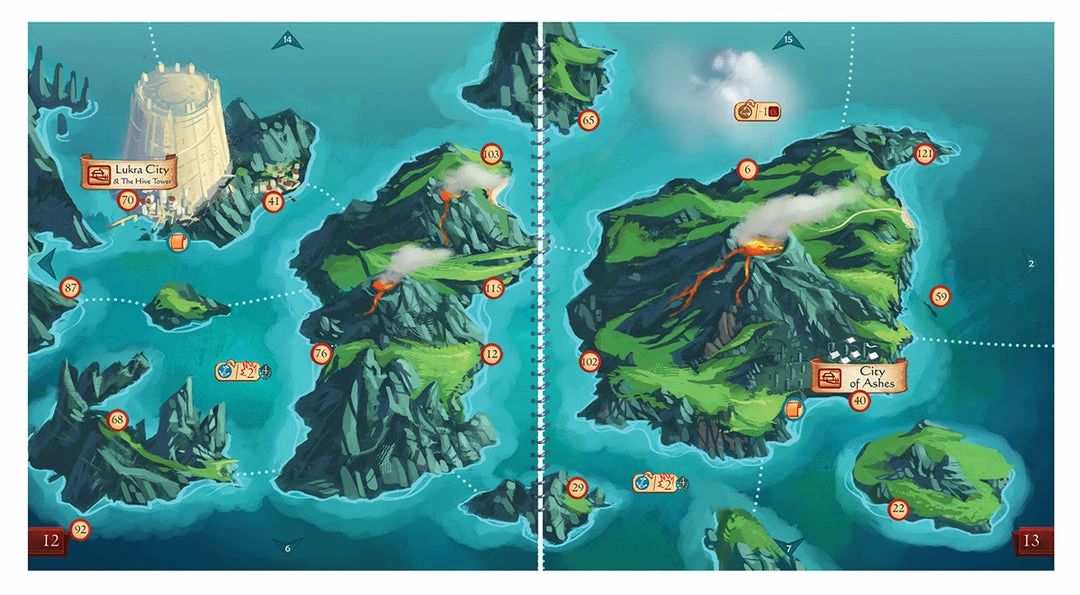 Sleeping Gods is a campaign game. Each session can last as long as you want. When you are ready to take a break, you mark your progress on a journey log sheet, making it easy to return to the same place in the game the next time you play. You can play solo or with friends throughout your campaign. It’s easy to swap players in and out at will. Your goal is to find at least fourteen totems hidden throughout the world. Like reading a book, you’ll complete this journey one or two hours at a time, discovering new lands, stories, and challenges along the way.